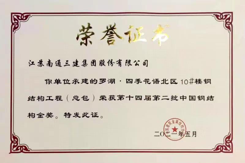 5月29日,2021年全国建筑钢结构行业大会在湖北·武汉召开,会议表彰了“第十四届(2019~2020年度)第二批中国钢结构金奖”获奖单位。星空在线承建的罗湖·四季花语北区10#楼钢结构工程、米其林沈阳轮胎扩建项目,荣获了“中国钢结构金奖”。这是南通三建首次在钢结构专业国家级奖项中获此殊荣,填补了承建装配式钢结构住宅工程的一项空白,实现了“从无到有”的突破。