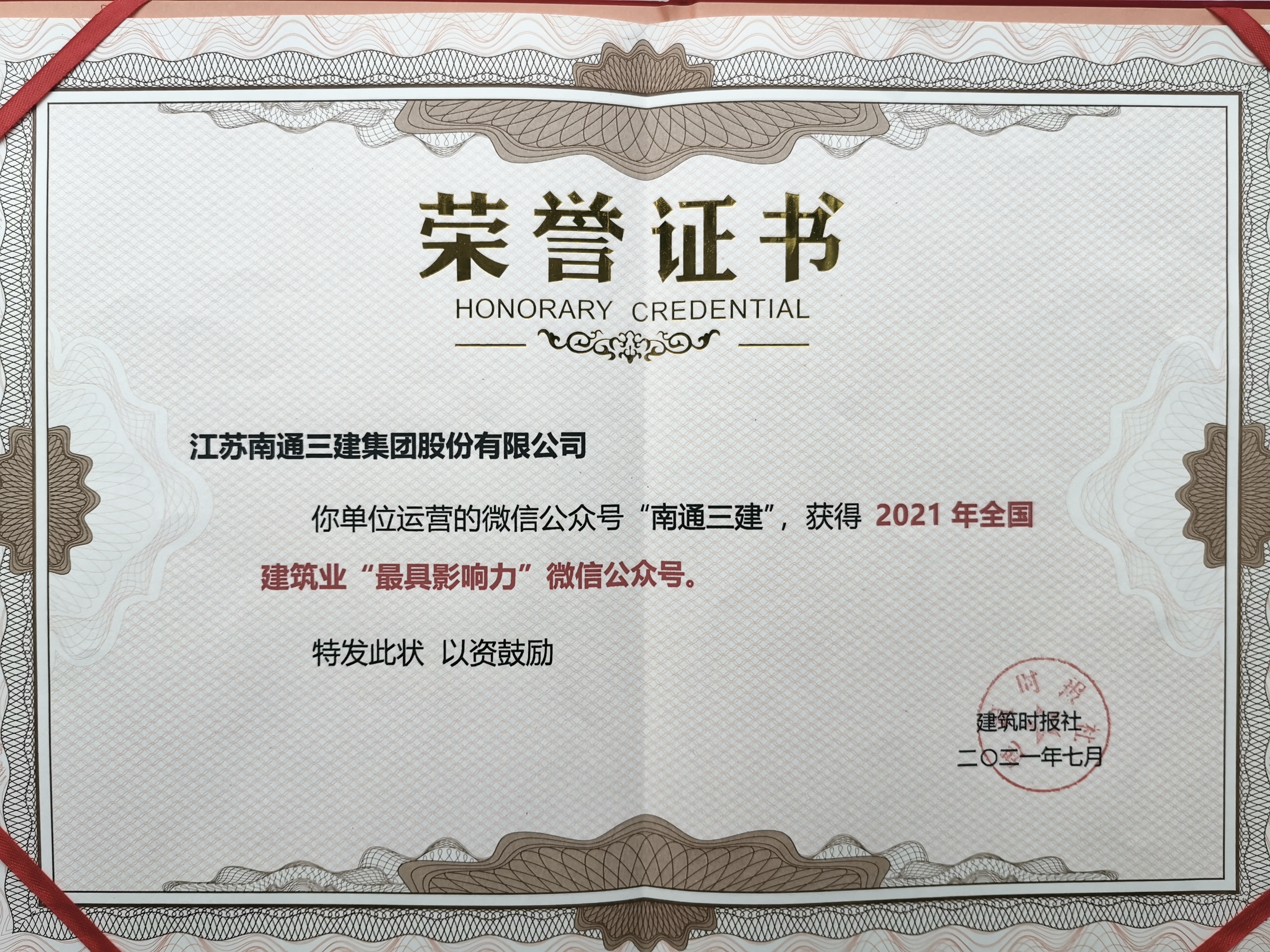 迭代传播方式,赋能品牌价值。7月16日,由建筑时报社主办的2021年建筑业微信公众号运维经验交流研讨会暨全国建筑业优秀公众号颁奖典礼在扬州举行。会上,“南通三建”企业官方微信公众号凭借优质的内容和出色的运维获评2021年全国建筑业“最具影响力”微信公众号。
