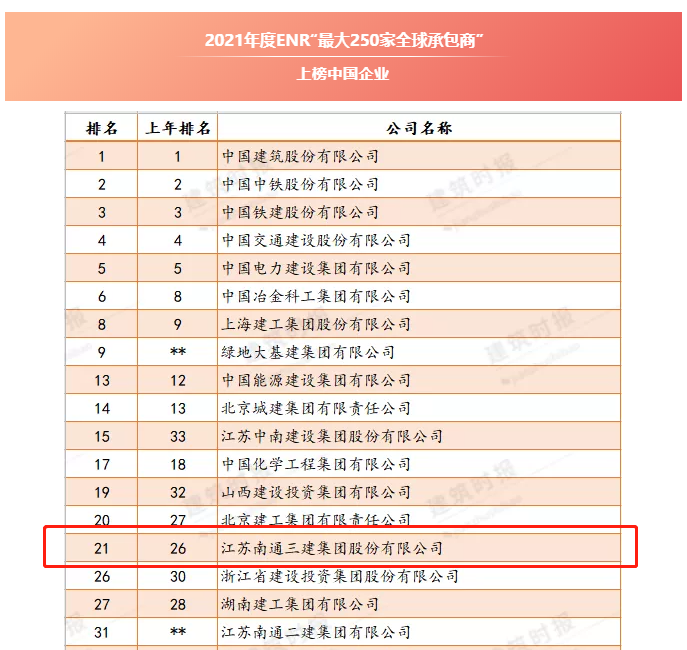 近日,2021年度美国《工程新闻纪录(ENR)》“最大250家全球承包商”(以国内与国际营业额合计排序)榜单发布,共59家中国企业上榜,南通三建凭借在国内外工程承包领域的综合实力和发展潜力,位居全球第21位,较上年稳步上升5位,此次是南通三建连续第11年入围该榜单。