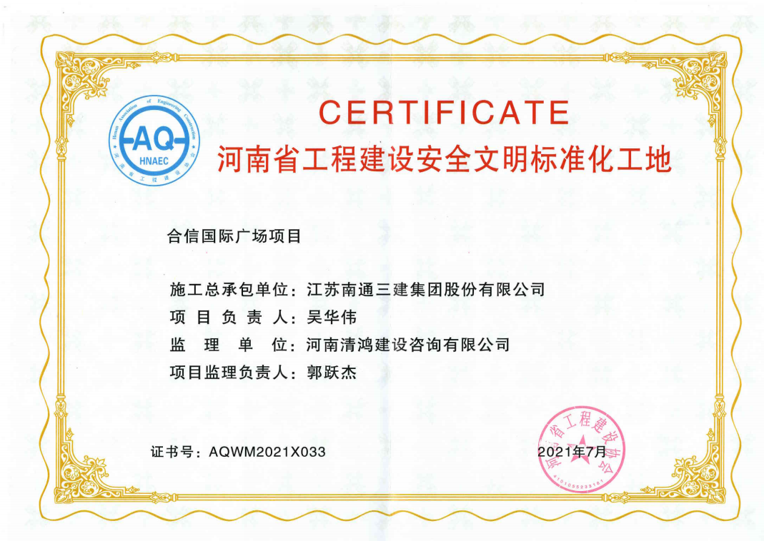 近日,经河南省工程建设协会专家组严格评审,由南通三建承建的合信国际广场、小李庄城中村改造项目荣获“河南省工程建设安全文明标准化工地”,是南通三建在河南市场标准化建设方面取得的又一次丰硕成果。