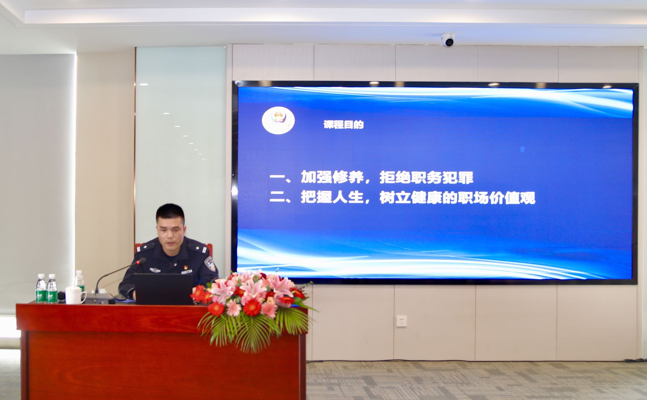 区公安局经侦大队副大队长范勋对预防职务犯罪进行阐述,对相关法律规定进行了培训。他强调,企业员工要把握人生,树立健康的职场价值观;要加强修养,拒绝职务犯罪;要提升思想境界,拒绝侥幸心理;要提升工作标准,拒绝贪污腐败;要提升责任担当,拒绝形式主义,始终严以律己,自觉做到廉洁从政。